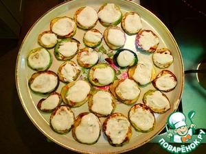• На тарелку выкладываем кабачки и каждое кольцо смазываем сметанным соусом.