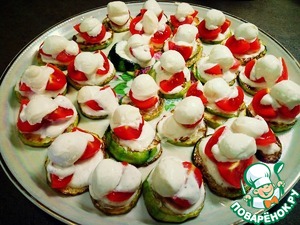 • Осталось выложить моцареллу на каждый кусочек канапе и всё готово! Я не рекомендую протыкать каждый кусочек палочкой, т. к. кабачки мягкие, и их не возможно будет таким образом взять, поэтому лучше брать их с помощью вилки :) Приятного аппетита!