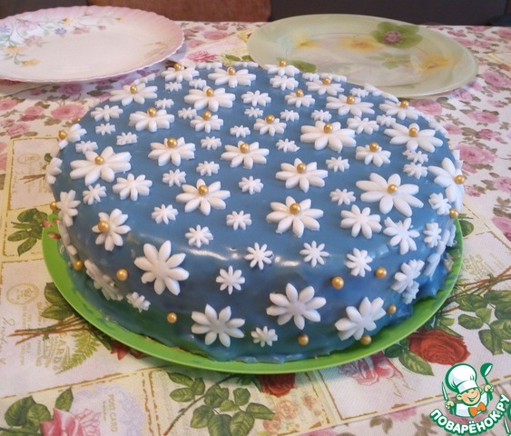 И голубая глазурь. Самый мой любимый и лёгкий торт: белая некрашеная мастика очень нарядно смотрится на голубой глазури, а на украшение ушло минут 10 (гости уже сидели за столом, когда я в панике разбрасывала ромашки по торту 😂)