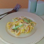 Яичный блинчик свернуть рулетом и нарезать тонкой соломкой. -