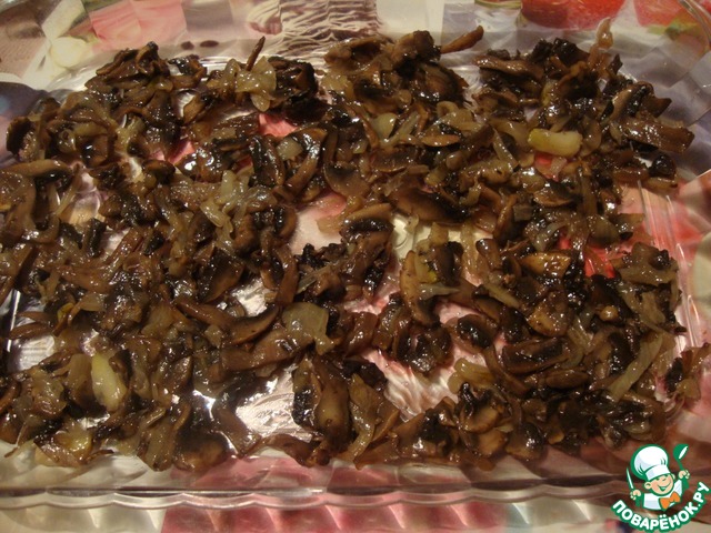 Обжарить грибы с луком. Я обжариваю отдельно, в конце обжаривания смешиваю все вместе, чтобы вкусы "подружились"...