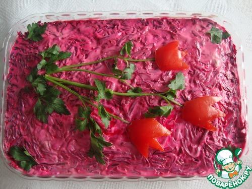 Недавно нашла в интернете неплохую альтернативу салату "Селедка под шубой". Буду рада, если кому-то салат тоже пригодится и понравится...