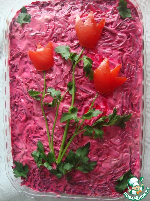 Украсить можно по желанию, я сделала цветочки из помидор и веточки из петрушки. Приятного аппетита!