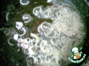 Лук, порезанный тонкими полукольцами и измельченный имбирь слегка обжарила в масле.