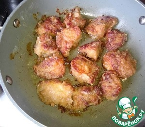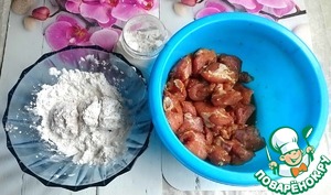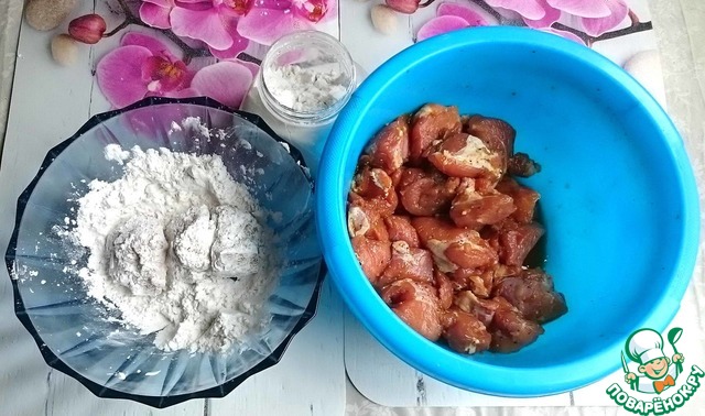 Кусочки мяса обваливаем в крахмале. Хорошо панируем каждый кусочек, но толщину панировки не делаем как "пирожок с сосиской". -