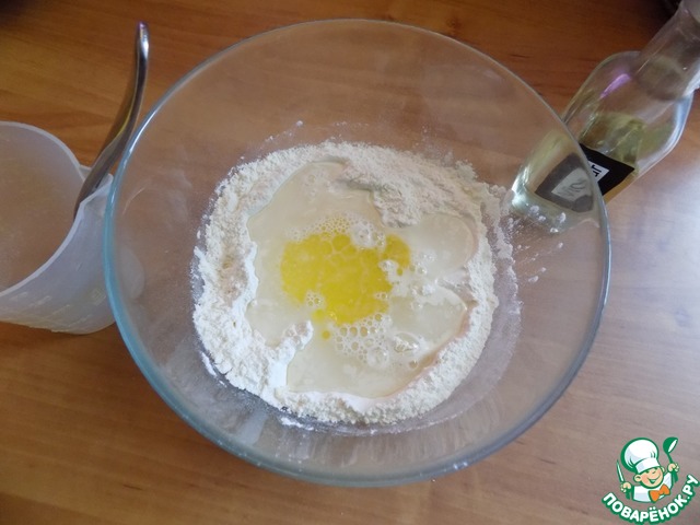 В центре муки делаем углубление и наливаем тёплой воды, добавляем оливковое масло.