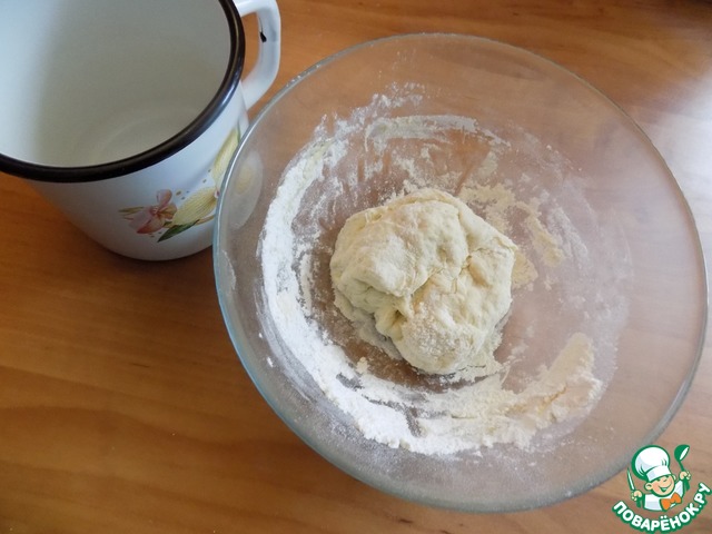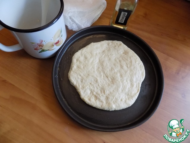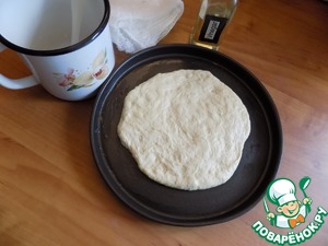 Затем мнём тесто с минуту, чтобы из него вышел воздух, и укладываем на форму или противень, подмазанный маслом. Распределяем по форме руками. Я растянула лепёшку ~ D=20 см. Накрываем опять и ставим в тепло, даём подняться.
