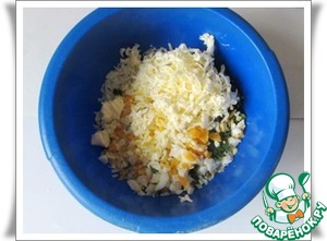 В миску отправляем натертый сыр, измельченные яйца, кинзу и натираем в миску замороженное сливочное масло. Добавляем по щепотке соли и перца и перемешиваем начинку. Можно добавить по вкусу любимые специи, а кинзу можно заменить другой зеленью: укропом, петрушкой, базиликом.