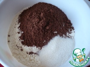 В миске соединить сухие ингредиенты: сахар, какао и муку.