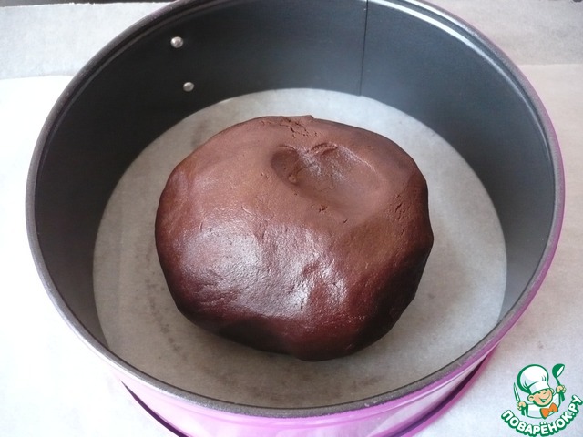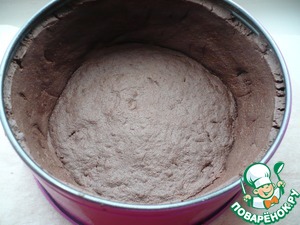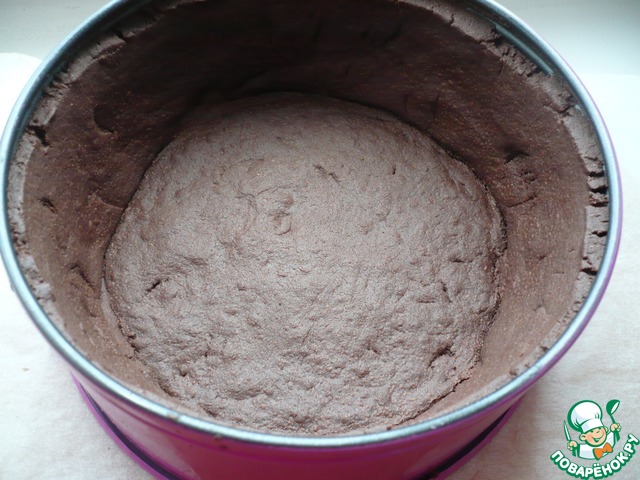 Противень застелить пергаментом и поставить кольцо. Положите тесто в кольцо, в котором будете выпекать основу. Я взяла кольцо 16х6 см. (размер кольца и высота не имеет значения, можно приготовить несколько порционных).
