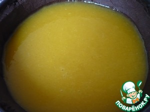 Нагрейте апельсиновый сок в сотейнике до первых признаков кипения. Снимите с плиты и добавьте набухший желатин, размешайте.