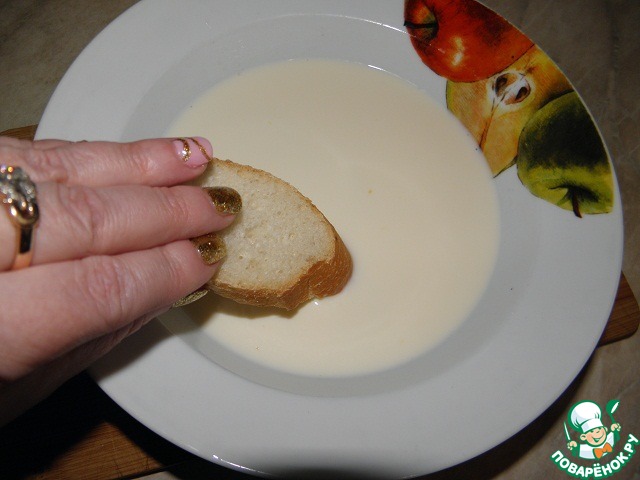 Багет режем на порционные кусочки, опускаем хлеб в сливочно-яичную смесь
