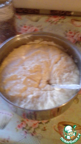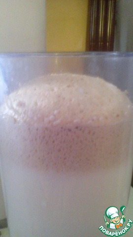Небольшое кол-во молока греем до 36-38 градусов, ( чуть теплое я использую кухонный термометр для определения температуры) в теплую жидкость добавляю 2 ст. л. сахара (из общего кол-ва сахара) и дрожжи и хорошо перемешиваю, и ставлю в теплое место ( к трубе)должна получится шапочка как на фото.