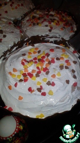 покрываем глазурью, я покрываю белково-заварным кремом. Зарание извиняюсь за ошибки и может быть что то пропустила, пишите отвечу всем. так как дети кружусь и делаю все сразу. Надеюсь вам понравится.