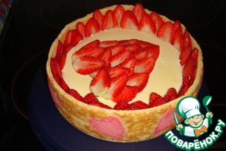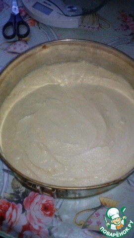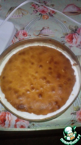 • Разрезаем корж и выкладываем в форму в которой выпекали, и выливаем половину суфле