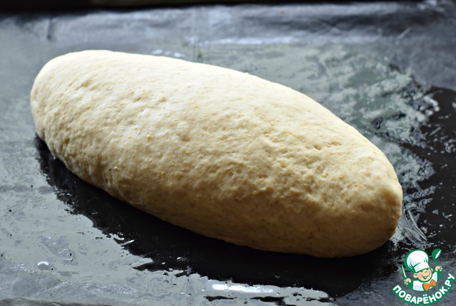 Выложить батон на противень, простеленный пекарской бумагой (смазать растительным маслом), силиконовым ковриком или антипригарным листом. Прикрыть полотенцем или салфеткой и поставить на 30-35 минут в теплое место. -
