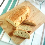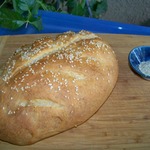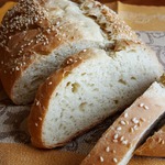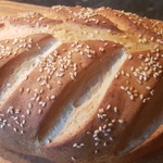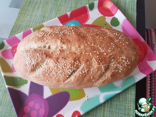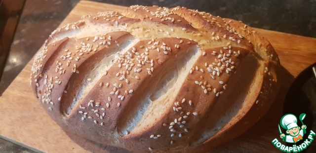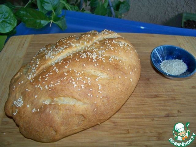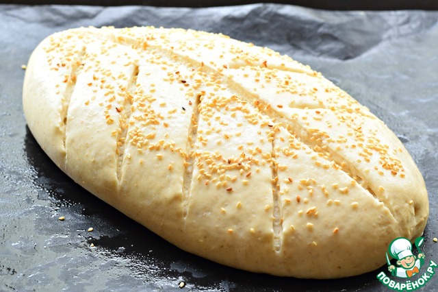 Острым ножом сделать на поверхности батона надрезы, сбрызнуть его теплой водой и присыпать кунжутом (по желанию)