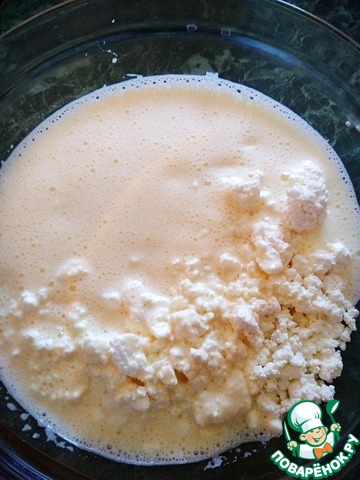 Яичную субстанцию добавляем к творогу. Хорошенько перемешиваем, избавляемся от крупных комочков.
