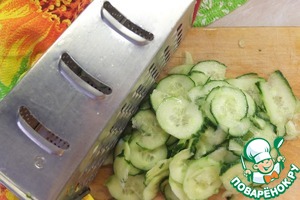 Огурец (у меня большой, продавался поштучно в индивидуальной упаковке) натираем тонкими кружками.