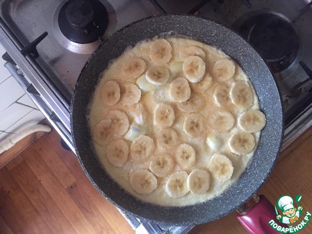 На разогретую сковороду с каплей масла вылить яичную смесь, огонь включить на максимум. Подождать, пока она снизу немного схватится, убавить огонь на минимум и выложить бананы.