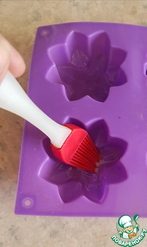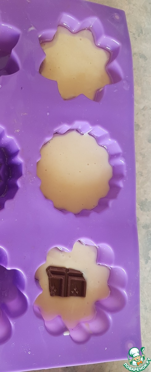 5. Смазываем формочки чуть чуть раст. маслом и запоняем формочки почти на половину. Я кусочки шоколадки вставляла. Можно изюм, цукаты как лучше угодно.