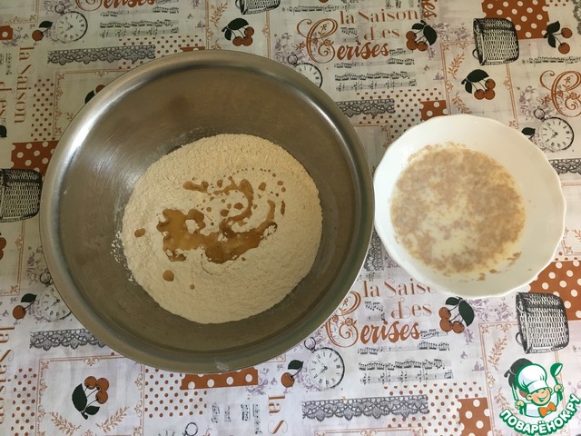 Через 10-15 минут добавляем нашу смесь в муку и замешиваем тесто. Накрываем полотенцем на 45-60 минут.