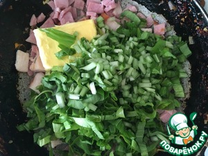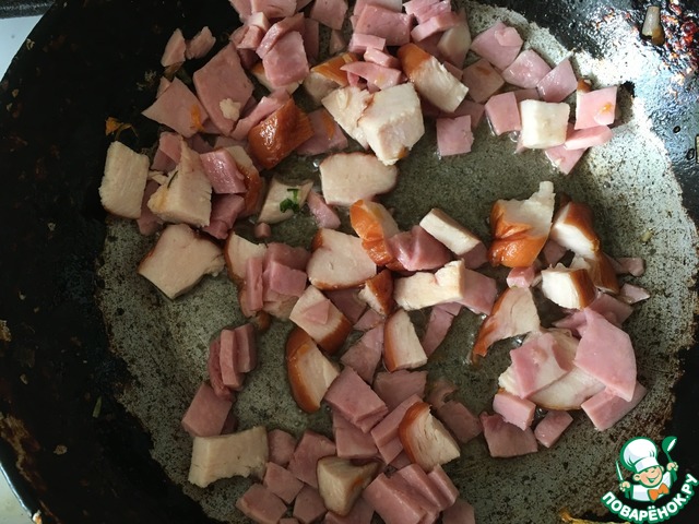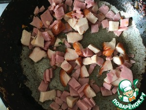 Ветчину и грудинку нарезаем кубиками и слегка обжариваем на сковороде.