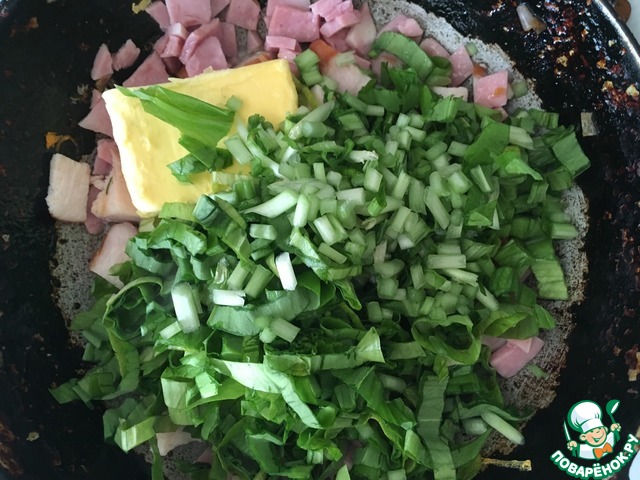 Добавляем сливочное масло и черемшу. Тушим на маленьком огне, помешивая, 3-4 минуты.