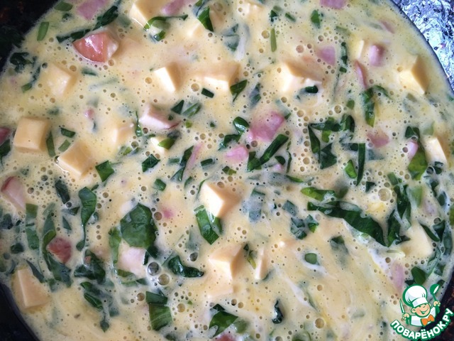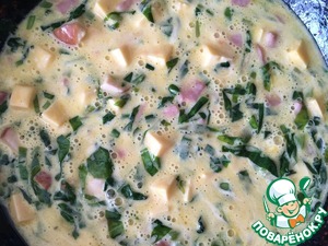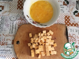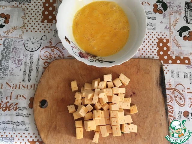 Яйца взбиваем, сыр режем кубиками. Смешиваем все со сметаной и добавляем к нашей зажарке.