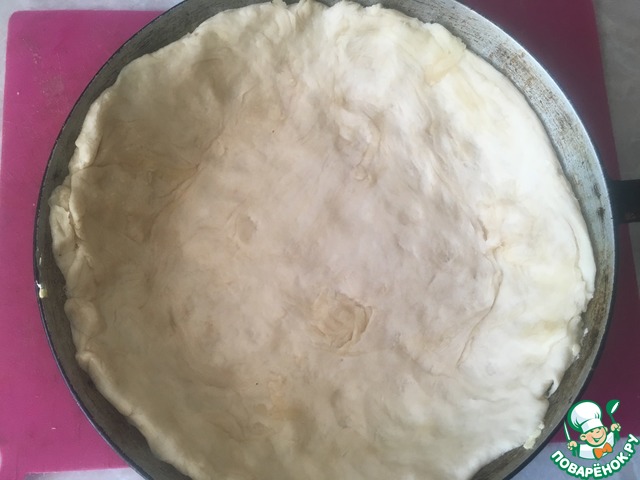 Добавляем нашу начинку и накрываем форму фольгой. Отправляем в разогретую до 200 градусов духовку на 20 минут. Затем фольгу снимаем и выпекаем пирог еще 30-40 минут, в зависимости от духовки.