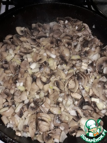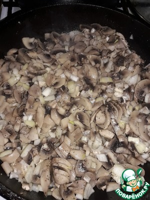 Шампиньоны обжарить со второй луковицей на растительеом масле. Посолить поперчить немного.