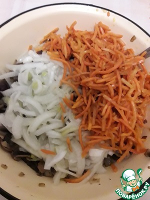 Когда все остынет и замаринуется лук, добавим морковь по корейски и все смешаем