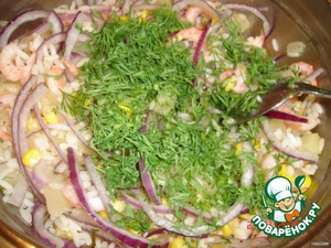 все ингридиенты поместить в большую миску: лук+ананасы+креветки+кукурузу. -