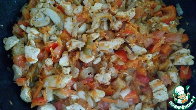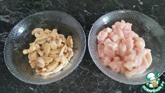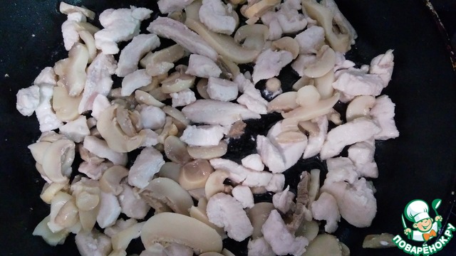 На разогретой сковородке обжариваем грудку, добавляем шампиньоны.