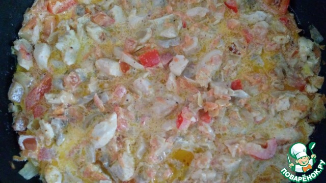 Солим по вкусу, добавляем специи, заливаем сливками и тушим до готовности под закрытой крышкой.
