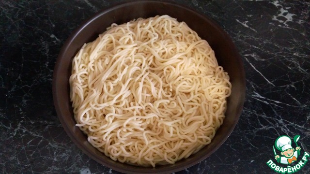 Отварные макароны откидываем на дуршлаг, промываем холодной водой и перекладываем на противень.