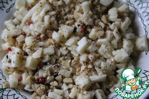 Орехи порубить, сыр нарезать мелким кубиком, добавить розовый перец и перемешать.
