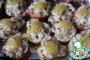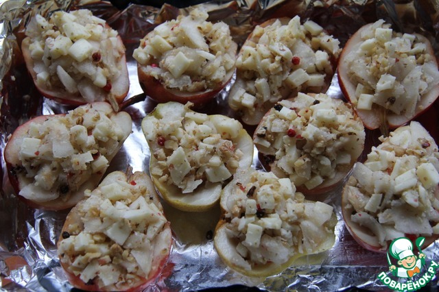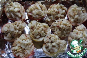 Из груш вынуть мякоть, сбрызнуть лимонным соком и тоже порезать мелким кубиком. Добавить к общей массе, перемешать. С противоположной стороны у половинок сделать небольшой срез для устойчивости. Наполнить половинки груш начинкой и поставить на противень, смазанный маслом.