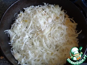 Для овощной подушки репчатый лук нарезаем полукольцами и поджариваем до зарумянивания.