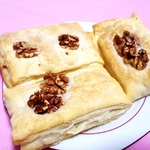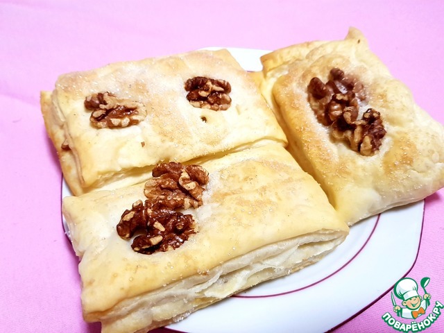На каждый кусочек теста положить по 2 ореховые половинки и полить сиропом.