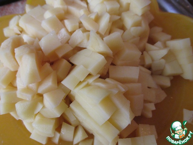• Очищенный картофель нарезать мелкими кубиками, примерно по 0,7 мм (что бы наверняка пропёкся)