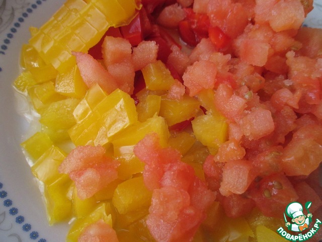 Болгарский перец и очищенный помидор нарезать так же некрупными кубиками.