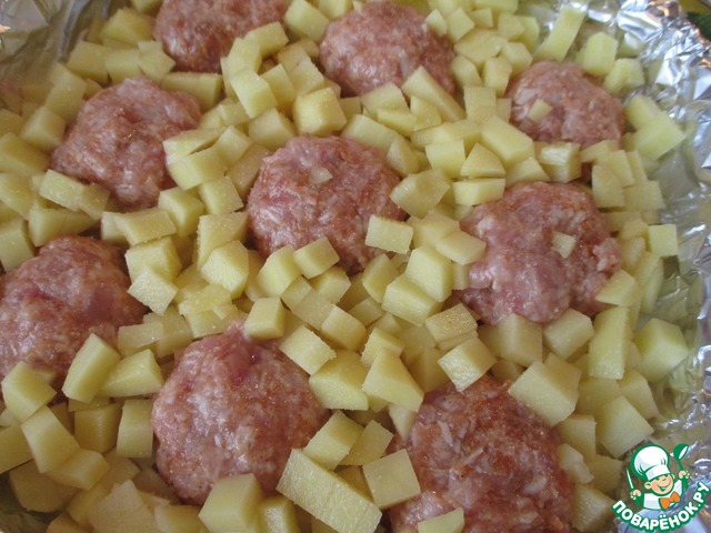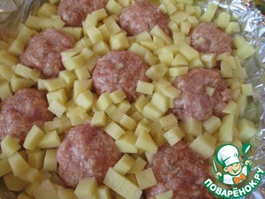 • Нарезанный картофель выложить вокруг фрикаделек. (Это опять же для того, что бы он хорошо пропёкся.)Слегка присолить.