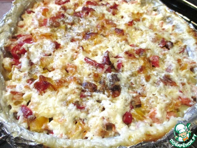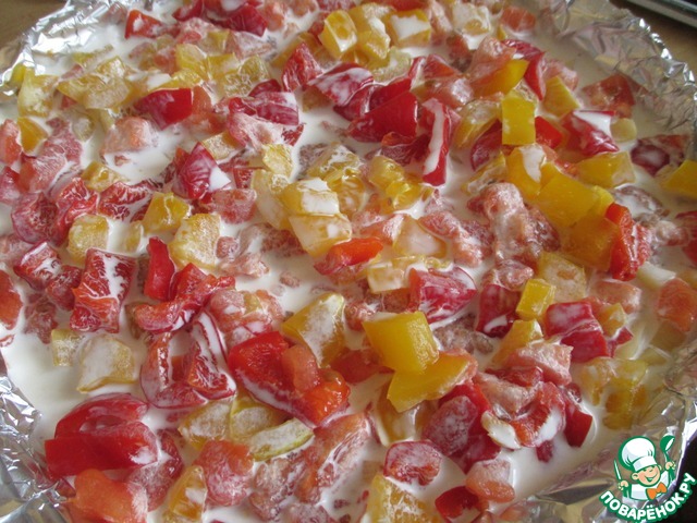 • Сверху выложить нарезанный перец и помидор. Посолить по вкусу. (не забываем, что фрикадельки тоже с приправой в которой есть соль)