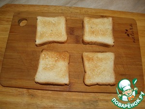 Режем французский длинный батон (у меня готовые кусочки тостового хлеба), подрумяниваем в тостере (если его нет, можно на сковороде) -