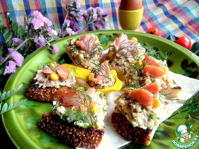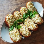 Выкладываем яичный салат на тосты, украшаем, посыпаем зеленью и подаем.