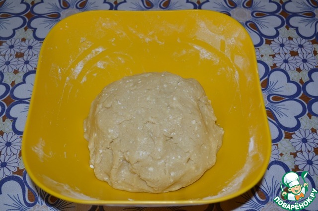 В отдельной посуде смешать 5 чайных ложечек кокосовой стружки и 60 грамм сахара. Шарик теста примять рукой на столе, чтобы получился кружочек с рваными краями. На один край положить немного сыпучей начинки.