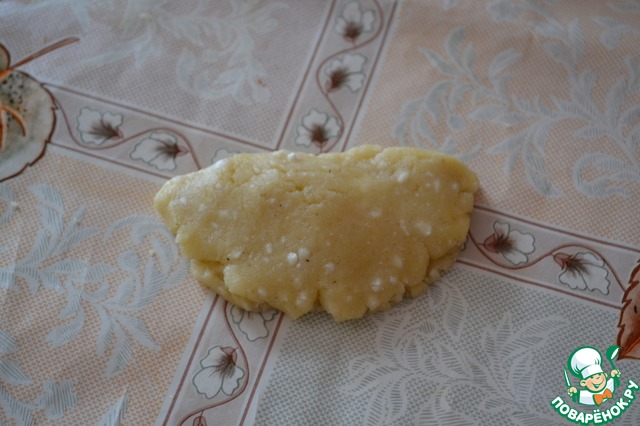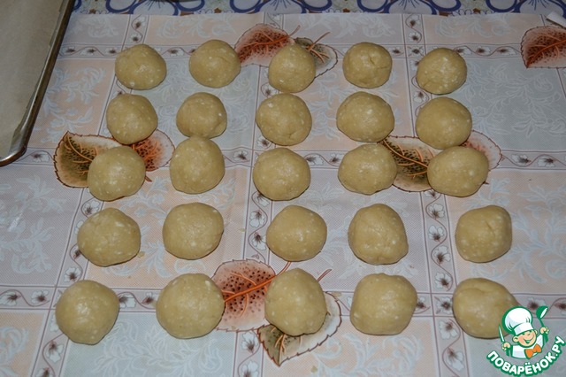Разделить тесто на 25 равных частей, скатать их в шарики. Стол мукой посыпать не надо, тесто совсем не липнет.