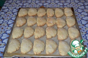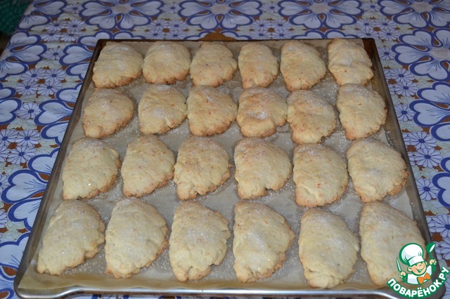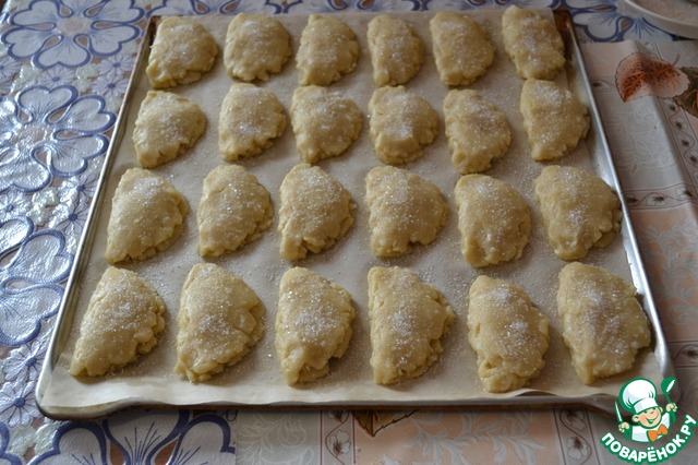 Выложить печенье на противень, застеленный бумагой для выпечки. Сверху посыпать сахаром.
