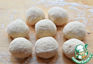 Рабочую поверхность хорошо присыпать мукой, выложить на нее тесто, обмять и разделить на восемь равных частей.